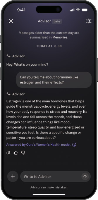 When a user inquires about women’s health via Oura Advisor, the chatbot activates the new model to draw on its research and knowledge resources while simultaneously assessing the user’s pertinent biometric signals, which encompass sleep, activity, cycle and pregnancy data, stress, and more.