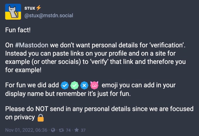 Some servers playfully approach the notion of verification in a less formal manner. For instance, the mstdn.social server permits users to add blue-and-white checkmarks and other emojis to their display names if they wish, giving an impression of verification, although these have no official meaning. (Much like Twitter’s revised verification system! But at no cost!)